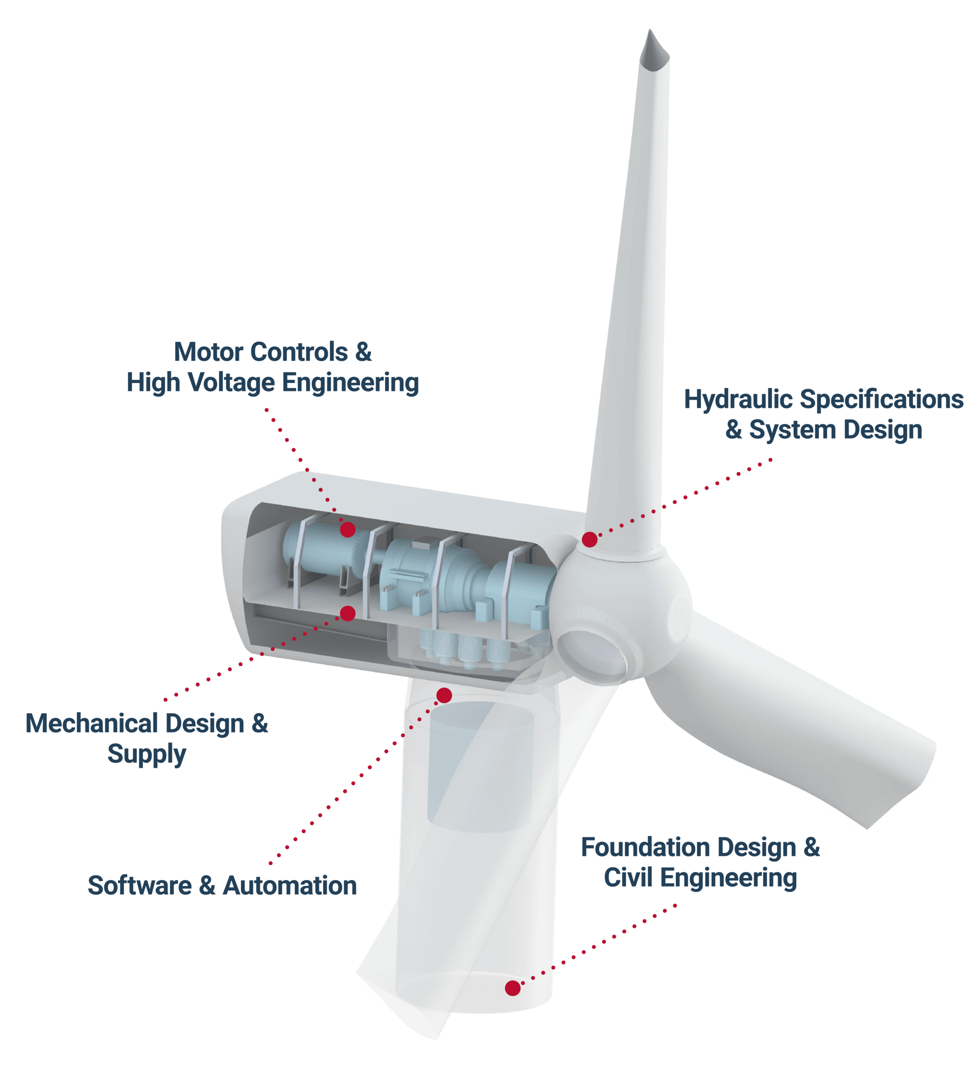 We work as an extension of your team, supporting you from the early concept phase to final product delivery. Our deep understanding of wind turbine core components and your technology allows us to provide the right expertise at the right time. Whether you need fresh insights, extra hands on deck, or a trusted partner to optimize development, we are here to help.